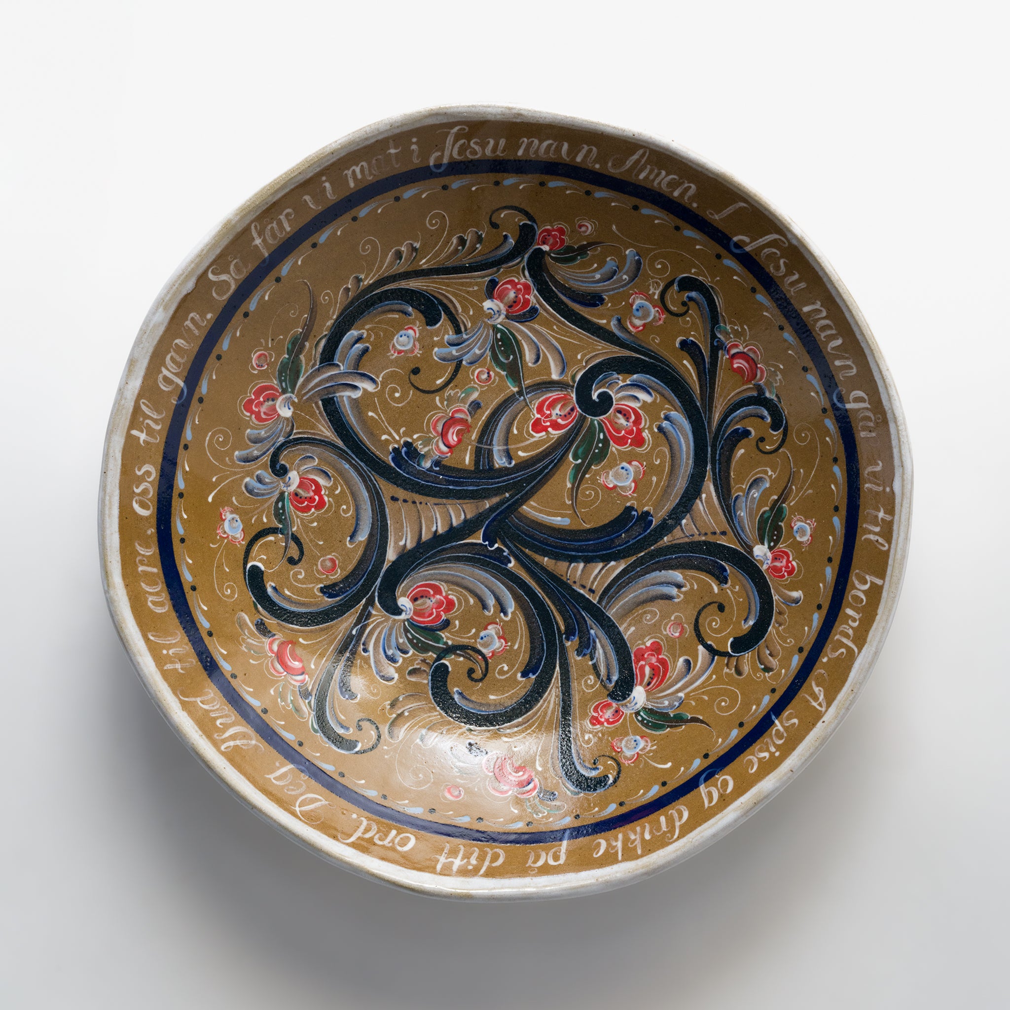 This large hand-built bowl was made from a large stoneware clay slab and fashioned from an existing bowl used as mold. Telemark rosemaling was hand painted to adorn the inside of the bowl, and the Norwegian Table Prayer was hand painted around the rim to provide a lovely border to encase the rosemaling and any contents placed inside the bowl. All glazes used are food safe, so this is a functional art.